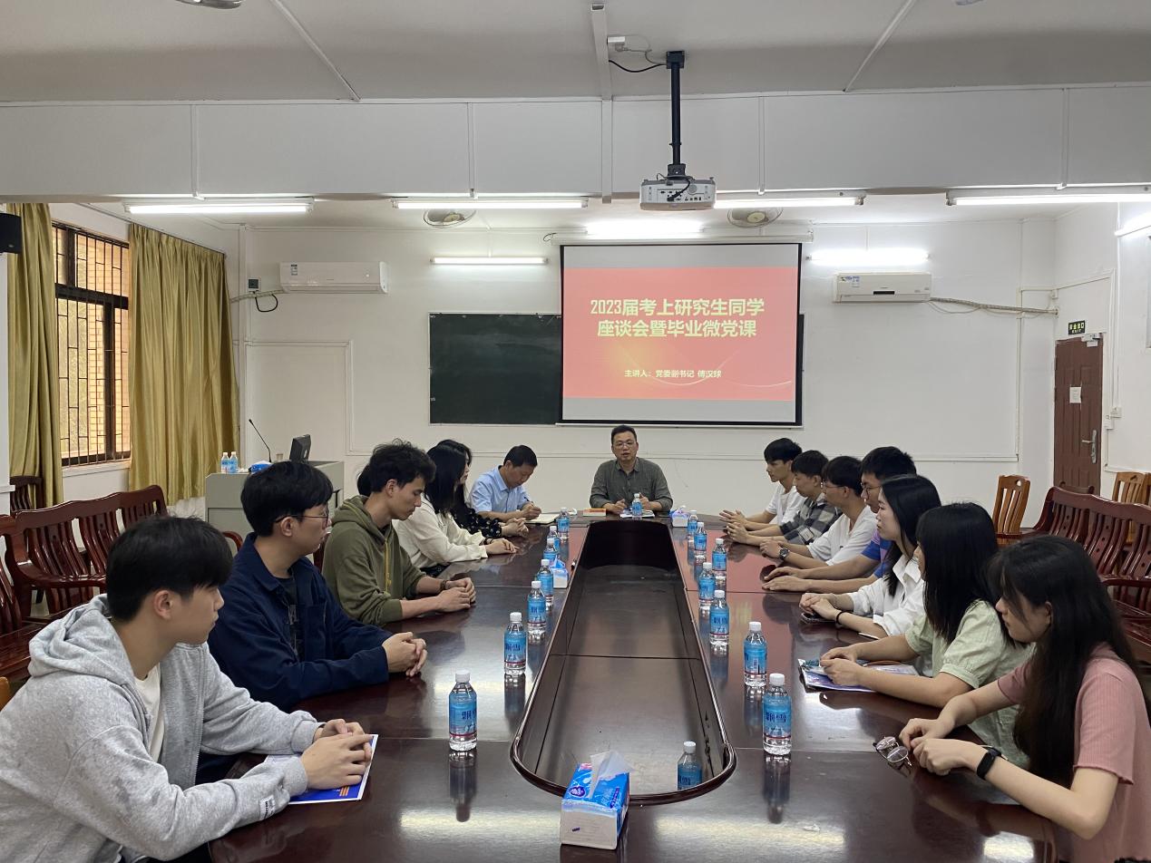 【本网讯】4月24日下午,js333金沙在学院208会议室召开毕业生考研成功座谈会暨毕业生微党课。学院党委副书记傅汉球参加会议并讲微党课,辅导员郑安徽主持,参加人员有考研成功毕业生、学生党员、入党积极分子代表等。