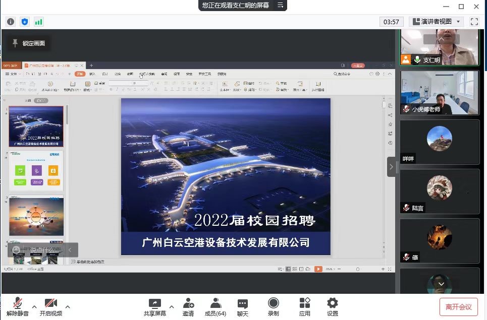共克时艰战疫情,就业服务不停歇,为进一步推进2022届毕业生就业工作,2022年3月23日下午,js333金沙在腾讯会议平台举办线上宣讲会,广州白云空港设备技术发展有限公司主管、学院党委副书记傅汉球、毕业班辅导员刘雨阳老师、js333金沙2022届毕业生参加此次宣讲会。宣讲会由傅汉球副书记主持。